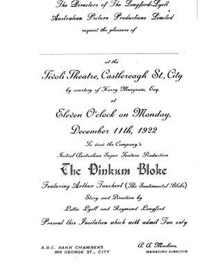 Originally titled The Bloke from Woolloomooloo, the film was a celebration of the working class. The Dinkum Bloke struck a chord with Australian audiences and was marketed at the time as “the best picture to date.” It was released in the UK as Gentleman in Mufti through Gaumont.