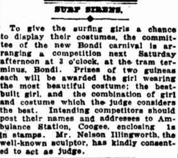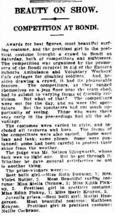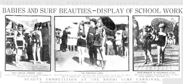 The only beauty competition recorded in those years was held at the Bondi Tram Shed, on February 5th, 1921, at Saturday, 3 pm. The girls gathered as did the spectators, and there were prizes for best figure/best built girl, most beautiful surfing costume, and prettiest girl in prettiest costume in a senior and junior category.