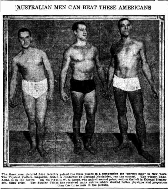 The competition for ‘the perfect man’ was also held in New York. The papers wrote that the Sunday Times had received many entries from Australian men who showed better physique and proportion than the three men in the picture. It was run by the same organisation for the same physical culture magazine. By the by, I stumbled across men’s beauty competitions that were held as far back as 1911 and wonder when they stopped calling men beautiful!