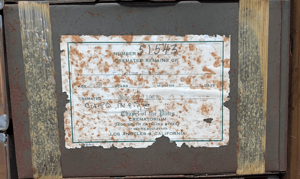 The last name change was a hindrance when searching for records of what hapened to Lotus in her later life. She was finally found in Vault 5 of the Chapel of the Pines vaults with private access only. On the outside of the box, it simply says Lotus Robinson.