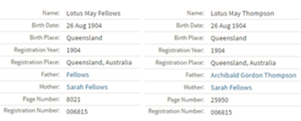 Nobody knows this. To the world, she was Lotus Thompson but she began life as Lotus May Fellows on 26 August, 1904. Unmarried, her mother, Sarah, gave birth to a daughter while she decided what to do about a surname. On page number 8021, the father was listed as simply “Fellows”.